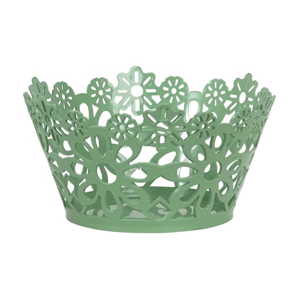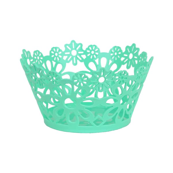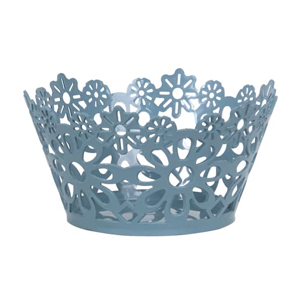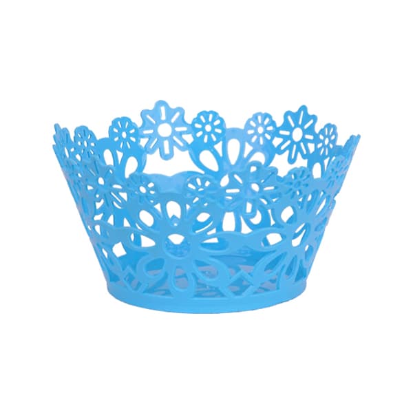 Sultan Round Basket 27ย is a decorative plastic storage basket with a floral cutout design. It is light blue in color and has an openwork pattern featuring various flower shapes, giving it a delicate and aesthetic appearance. The basket is conical, with a wider opening at the top and a solid circular base for stability. It is suitable for holding small household items, organizing accessories, or serving as a decorative piece in a home or office setting.
