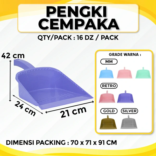 Cempaka plastic dustpan is a plastic dustpan with a wide, slightly curved scoop designed for collecting dust, dirt, and debris. It has a short handle with a hole at the top, allowing it to be hung for storage. The dustpan is brown or mustard yellow in color and features a slightly raised lip with small ridges to help trap dirt efficiently. Its sturdy plastic construction makes it lightweight and easy to use for household or commercial cleaning tasks.