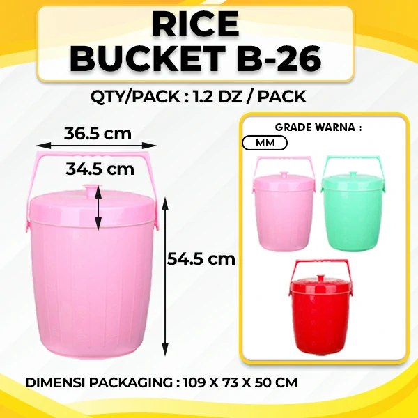 CV Wahana Surya adalah Pabrik Plastik Perabotan Rumah Tangga seperti Rice bucket b 26 yang digunakan sebagai tempat nasi ataupun tempat es serta sebagai pelengkap alat makan dirumah. Dengan tersedia beberapa pilihan Ukuran Warna, membuat produk Rice Bucket sangat cocok digunakan dirumah anda atau untuk keperluan usaha anda. Rice Bucket dibuat dari bahan baku plastik yang aman dan tidak mudah pecah.