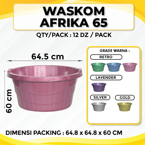 Waskom Afrika 65 ini dijual dengan harga yang sangat terjangkau dan dapat dibeli secara grosir dalam jumlah banyak. Jadinya sangat cocok digunakan sebagai bingkisan atau souvenir saat acara besar, pas banget buat yang sedang cari bak cuci baju dalam jumlah banyak dengan harga murah.