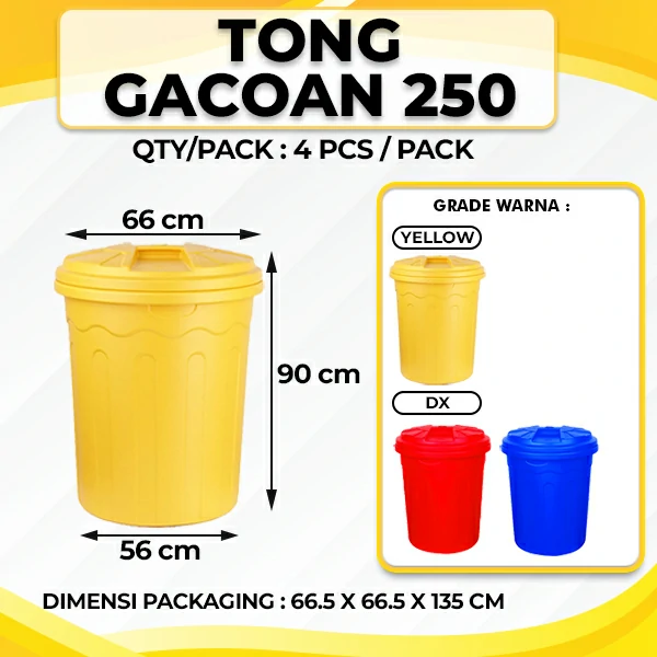Tong Gacoan 250 merupakan tong besar yang berfungsi untuk menyimpan air di rumah atau dijadikan sebagai wadah sampah berukuran besar. Sudah dilengkapi dengan tutup yang dapat diputar, sehingga lebih mudah jika ingin dibuka.