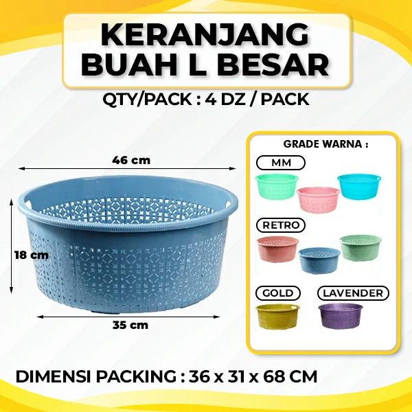 CV Wahana Surya adalah Pabrik Plastik Perabotan Rumah Tangga seperti keranjang plastik bulat besar yang digunakan untuk mencuci atau menyimpan bahan masakan ataupun buah – buahan. Dengan menggunakan warna yang cantik serta memiliki desain yang menarik, sangat cocok digunakan untuk keperluan rumah tangga atau keperluan usaha anda. Keranjang Buah Besar dibuat dari bahan baku plastik yang aman dan tidak mudah pecah.