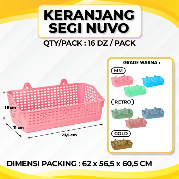 Keranjang Segi Nuvo merupakan keranjang plastik kotak yang berfungsi untuk tempat menyimpan berbagai barang berukuran kecil, sehingga membuat ruangan terlihat lebih bersih dan rapi. Sudah dilengkapi dengan lubang pengait pada bagian atas, jadinya bisa ditempelkan di dinding.