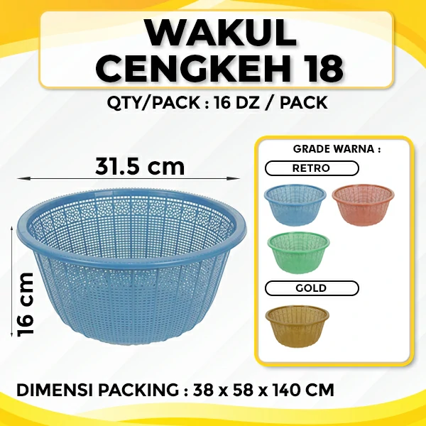 Wakul Cengkeh 18 merupakan bakul plastik yang berfungsi untuk untuk berbagai keperluan seperti mencuci perlengkapan memasak, menampung cucian, menampung bahan-bahan dapur, hingga kebutuhan memasak dalam jumlah besar. Sudah dirancang dengan motif lubang pada bagian seluruh produk, sangat cocok untuk melengkapi kebutuhan rumah tangga Anda.
