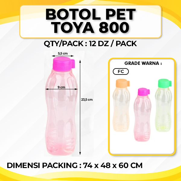 Botol PET Toya 800 merupaka tumblr botol yang berfungsi untuk menyimpan air minum saat melakukan kegiatan di luar ruangan seperti piknik, bersekolah, berolahraga, dan lain sebagainya. Sudah dilengkapi dengan tutup ulir yang rapat, sehingga mampu membuat minuman yang disimpan tidak mudah tumpah dan tetap aman.