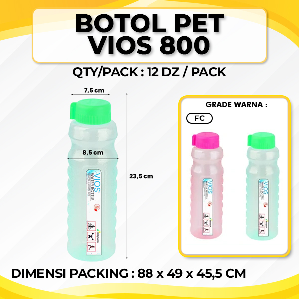 Botol PET VIOS 800 merupakan tumblr botol yang berfungsi untuk menyimpan air minum saat melakukan kegiatan di luar ruangan seperti piknik, bersekolah, berolahraga, dan lain sebagainya. Sudah dilengkapi dengan tutup ulir yang rapat, sehingga mampu membuat minuman yang disimpan tidak mudah tumpah dan tetap aman.