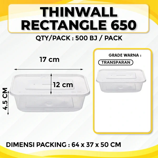 Thinwall Rectangle 650 merupakan kotak makan plastik yang diproduksi pabrik thinwall CV Wahana Surya, berfungsi untuk tempat menyimpan makanan kering hingga berkuah. Sudah dilengkapi dengan tutup rapat kedap kedap udara membuat makanan aman tidak mudah tumpah.