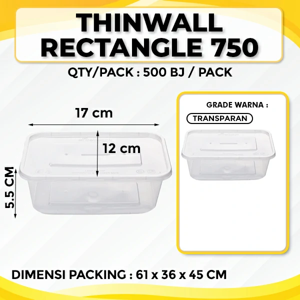 Thinwall Rectangle 750 merupakan thinwall persegi panjang yang diproduksi pabrik thinwall Susan Plastic Houseware, berfungsi untuk tempat menyimpan makanan kering hingga berkuah. Sudah dilengkapi dengan tutup rapat kedap kedap udara membuat makanan aman tidak mudah tumpah.
