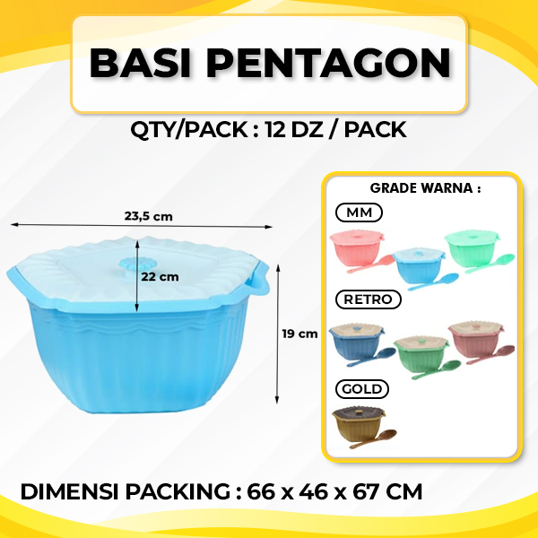Basi Pentagon merupakan tempat lauk plastik yang berfungsi untuk menyajikan berbagai jenis makanan, baik makanan panas maupun dingin. Sudah dilengkapi dengan tutup rapat kedap udara, sehingga makanan yang disimpan tidak mudah terkena udara atau serangga dari luar.