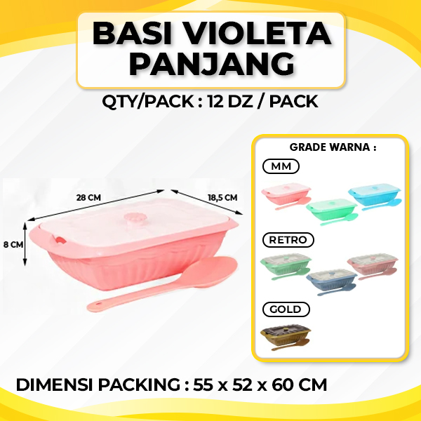 Basi Violetta Panjang merupakan mangkok lauk plastik yang berfungsi sebagai tempat menyimpan makanan berkuah atau lauk di rumah agar tampilan terlihat lebih estetik. Sudah dilengkapi dengan sendok sayur desain menarik sehingga membuat tampilannya terlihat menarik.