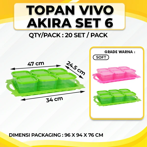 CV Wahana Surya adalah Pabrik Plastik Perabotan Rumah Tangga seperti toples plastik 1 set dengan nampan yang digunakan untuk tempat penyimpanan makanan ringan di rumah atau tempat usaha anda. Dilengkapi penutup yang kedap udar, menjaga kualitas makanan didalam terjaga dengan baik serta Topan Vivo Set Isi 6 + Akira menggunakan warna dan desain yang menarik, sangat cocok digunakan untuk acara hajatan atau untuk keperluan usaha anda. Dibuat dari bahan baku plastik yang aman dan tidak mudah pecah.