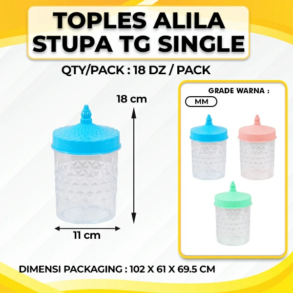 Toples Alila Stupa Tinggi Single merupakan toples plastik lebaran yang berfungsi untuk menyimpan makanan atau camilan di rumah agar tetap renyah. Sudah dilengkapi dengan tutup rapat kedap udara, sehingga makanan tidak mudah melempem.